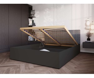 Der integrierte Bettkasten ermöglicht eine praktische Aufbewahrung von Bettdecken, Kissen und anderen Textilien. Der Innenraum des Bettes wurde durch drei Querstreben verstärkt, die zwei funktionale Fächer bilden und die Stabilität der gesamten Konstruktion erhöhen. Der hoch belastbare Lattenrost mit Federmechanismus ermöglicht ein einfaches und sicheres Anheben der Matratze.