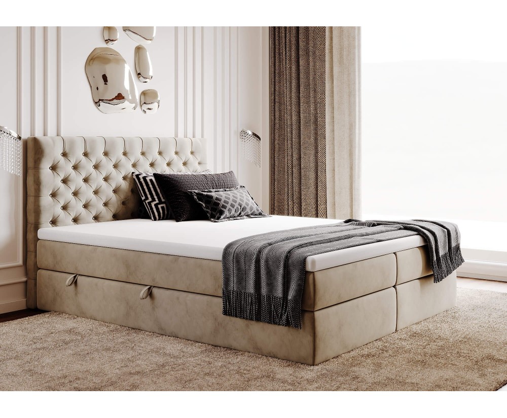 Das Boxspringbett MAGNUS 15A ist ein stilvolles, elegantes Bett mit einem schönen modernen Kopfteil, das durch seine Chesterfield-Steppung besticht. Sein interessantes Design, das luxoriöse Ästhetik mit Komfort verbindet, schafft im Schlafzimmer eine einzigartige Stimmung. Hergestellt aus hochwertigen Materialien, um sicherzustellen, dass das Bett robust und von langlebiger Qualität ist.