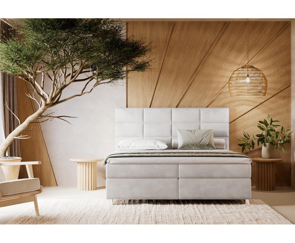 Das komfortabel gepolsterte Boxspringbett Intaro MEROO 5M überzeugt durch ausdruckstarke Formwirkung. Das elegante Kopfteil zeichnet sicht durch dekorative Nähte mit Schokoladenmuster aus, was einen besonderen Charakter dieses Möbelstücks betont. Verchromte Füße sind formstabil und tragfähig. Hochwertige Materialien und robuste Ausführung mit viel Liebe zum Detail garantieren lange Lebensdauer.