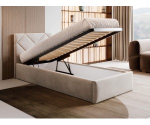 AZURO S03 Einzelbett 90x200 cm mit Bettkasten, Lattenrost und pflegeleichtem Stoff, vom Fußteil geöffnet