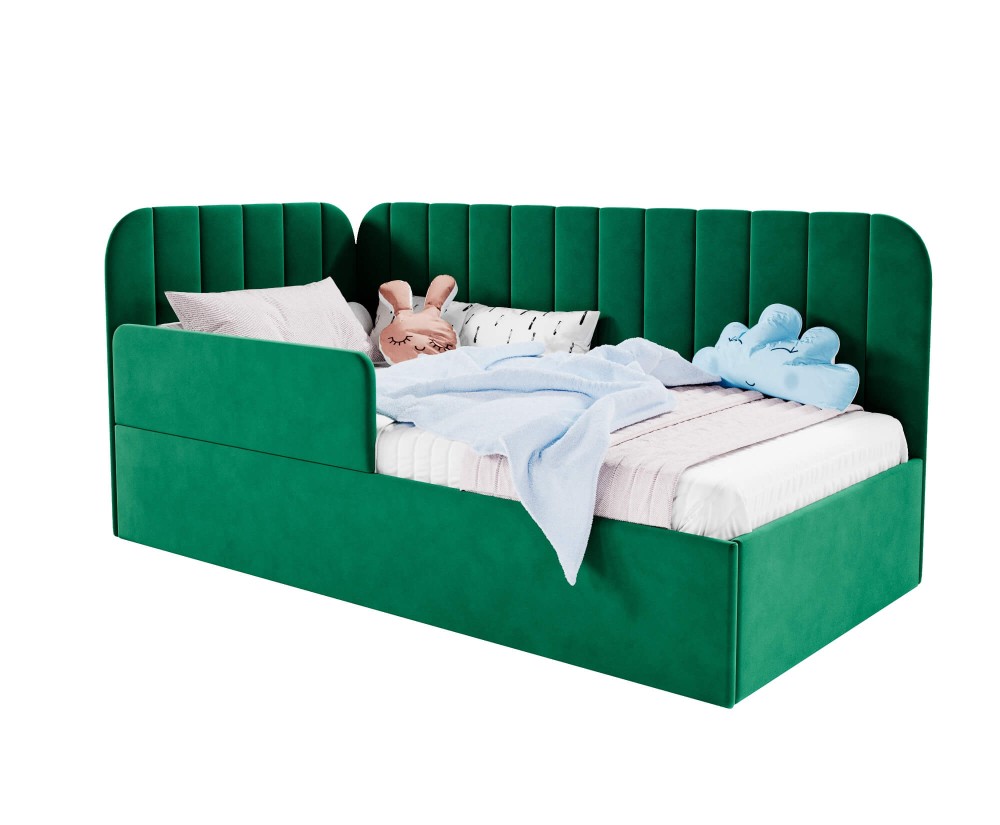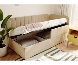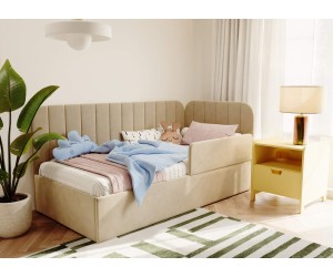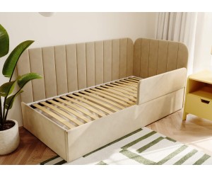Die integrierte Schutzbarriere fügt sich dezent in die Form des Möbelstücks ein und schützt wirksam vor einem versehentlichen Herausfallen aus dem Bett während des Schlafs. Die weiche Polsterung sowie sorgfältig ausgearbeitete Details verleihen dem Gesamtbild einen gemütlichen und zugleich luxuriösen Charakter, der Entspannung und Erholung fördert.