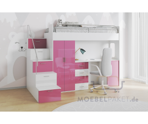 Das Hochbett MAJA 4S ist eine multifunktionale Lösung für das Kinder- und Jugendzimmer. Das Set besteht aus einem Schreibtisch, Bett, Kleiderschrank, Treppe mit fünf aufschließbaren Stufen, die als Fächer benutzt werden können; erhältlich in vielen Farbvarianten: Hochglanz weiß, schwarz, rosa, grau, himmelblau, violett, beige. Die Liegeflächensicherung als Absturzschutz erfolgt durch Metallverstrebung. Die Fronten sind aus der hochwertigen MDF-Hochglanzplatte gefertigt. Der Lattenrost für Hochbett ist im Preis enthalten, die Matratze ist nicht inklusive. Diese können Sie separat in unserem Shop bestellen. Der Einstieg zur Liegefläche erfolgt über die Treppe, die wahlweise rechts sowie links montiert werden kann.