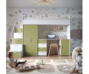 Suchen Sie nach einer praktischen und stilvollen Lösung für Ihr Kinder- oder Jugendzimmer? Das Etagenbett MAJA 4S bietet eine moderne und kompakte Konstruktion, die einen bequemen Schlafplatz, einen funktionalen Schreibtisch, einen sicheren Einstieg zur Liegefläche mit geräumigen Fächern und einen Kleiderschrank miteinander vereint – alles, was Sie brauchen, in einem Set!