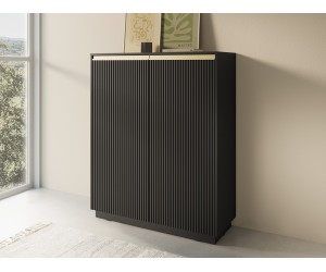 SIMPLE - eine elegante, hohe zweitürige Kommode für das Wohnzimmer. Das Möbel zeichnet sich durch dezent geriffelte Fronten aus, die aus hochwertiger MDF-Möbelplatte gefertigt werden. Funktionale und geräumige Kommode mit Einlegeböden innen. Der Korpus aus Laminatplatte stellt sicher, dass das Möbel solide und robust ist. Die Kommode fügt sich wunderbar in moderne Einrichtungsstile ein.