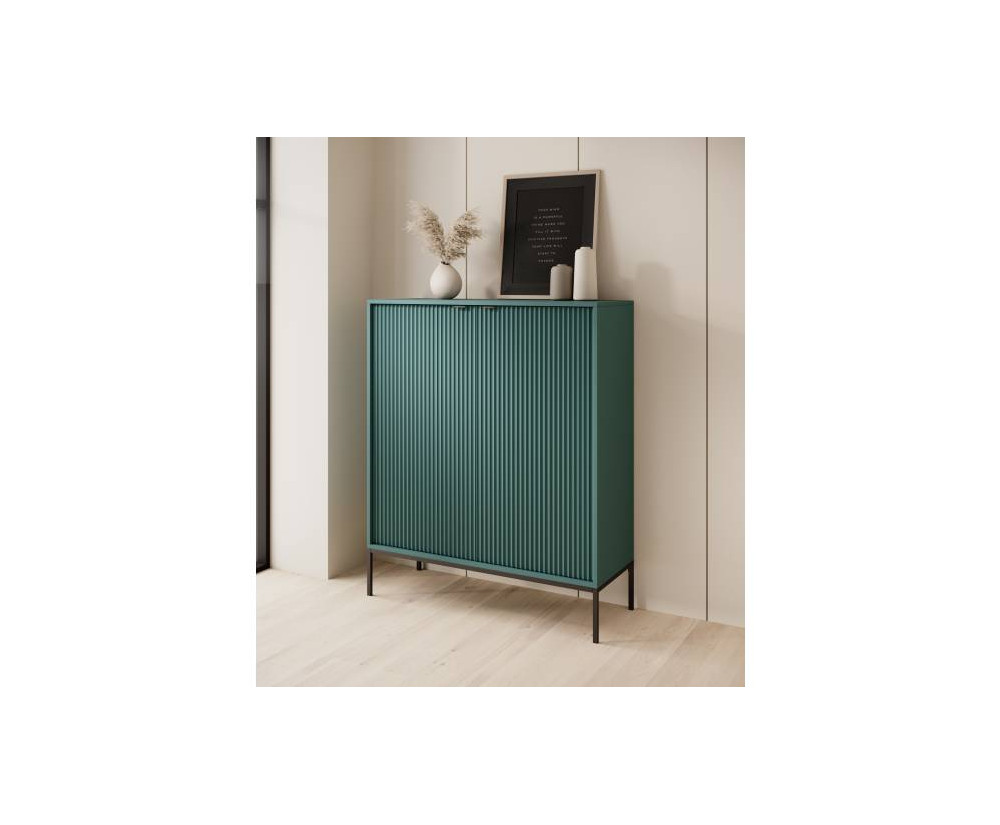 Die Kommode SIENA Labrador bezieht sich auf den Loft-Stil, was bedeutet, dass sie ein strenges und modernes Aussehen hat. Die Fronten der Kommode zeichnen sich durch eine dekorative Riffelung aus, die den Möbeln einen besonderen Charakter und ein einzigartiges Aussehen verleiht. Die Kommode hat eine tiefgrüne Farbe im Labrador-Farbton, eine der modischsten Farben, die den Möbeln eine interessante Präsenz schenkt. Die Kommode ist zweitürig mit Regalen in der Mitte, die Platz für die Aufbewahrung verschiedener Gegenstände bieten. Das Möbel ist aus der hochwertigen Laminatplatte mit ABS-Kanten ausgeführt, deshalb ist es stabil und robust. Die Kommode verfügt über Griffe und Gestell in Schwarz oder Gold, was Eleganz und ein exklusives Aussehen betont. Die Kommode dient nicht nur als praktisches Aufbewahrungsmöbel, sondern ist auch ein raffiniertes Dekorelement, das sich perfekt in moderne Innenräume einfügt.