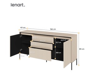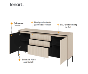TREND-TR-01 ist eine moderne Kommode zweitürig mit drei Schubladen, erhältlich im sandbeigen Farbton / Regalfarbe schwarz. Diese geräumige und funktionale Kommode wird eine sinnvolle Ergänzung für den Wohn- oder Essbereich. Besonders auffallend sind die geriffelten Fronten, deren elegante Präsenz durch die LED-Beleuchtung betont wird. Die unikale Musterung verleiht dem Möbelstück eine attraktive und originelle Optik. Die schwarzen Metallfüße unterstreichen den Loft-Stil. Das Modell bietet viele praktische Lösungen. Die geräumigen Schubladen eignen sich ideal zur Aufbewahrung von Kleidung, Unterwäsche oder verschiedenen Accessoires. Alles bleibt griffbereit und stets geordnet. Die Schränke bieten weitere Unterbringungsmöglichkeiten. Die breite Ablagefläche lässt sich vielseitig gestalten, hier können Fotorahmen oder andere Deko-Elemente exponiert werden, die dem Innenraum einen einmaligen Charakter verleihen. Hergestellt aus robuster Laminatplatte, veredelt mit ABS-Kanten. Mit dem Push-to-Open-System ist das Öffnen der Fronten ohne Griff denkbar einfach. Die Kommode fügt sich ideal in moderne Einrichtungsstile ein.