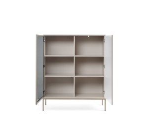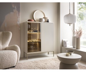 Die Vitrine verfügt über zwei Türen, hinter denen sich geräumige Fächer befinden – ideal für Geschirr, Dekoration, Bücher oder andere Einrichtungsgegenstände. Dank dem PUSH-TO-OPEN-System lässt sich das Möbelstück grifflos öffnen, was seinen minimalistischen, modernen Charakter unterstreicht.