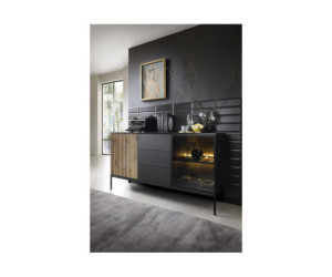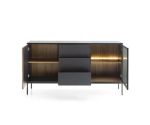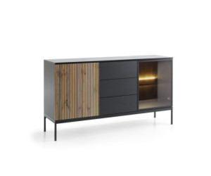 Die geräumige zweitürige Kommode KSZ154 EVITA mit 3 Schubladen ist die perfekte Ergänzung für Ihr Wohnzimmer. Das einzigartige Design dieser Kommode verbindet Modernität mit Eleganz und schafft einen einzigartigen Look. Die Fronten der Kommode bestehen aus Lamellen, die dem Möbel Tiefe und Textur verleihen. Diese stilvollen Details sind ein echter Hingucker und verleihen der Kommode einen einzigartigen Charakter. Gehärtetes Glas in der Farbe Antisol Schwarz fügt einen luxuriösen Akzent hinzu. Sie reflektieren das Licht, verleihen dem Innenraum Glanz und sorgen gleichzeitig für eine außergewöhnliche Haltbarkeit.