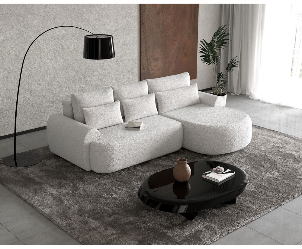 FERRO 58 ist ein modernes und äußerst bequemes Ecksofa, das Ihre Erwartungen in vielerlei Hinsicht erfüllt. Dieses elegante Möbelstück wurde mit Blick auf Komfort und Funktionalität entworfen und bietet viele Vorteile, die Ihr Wohnzimmer zu einem noch mehr freundlichen und praktischen Ort zum Entspannen machen. Das Ecksofa mit Schlaffunktion lässt sich einfach und schnell in einen bequemen Schlafplatz verwandeln, was eine unschätzbare Lösung ist, wenn Sie Gäste haben oder sich einfach nach einem anstrengenden Tag erholen möchten. Nach dem Ausklappen des Ecksofas entsteht eine gemütliche Schlafgelegenheit, die Ihnen einen angenehmen Schlaf garantiert. Der funktionale Bettkasten bietet einen zusätzlichen Stauraum für die Aufbewahrung von Bettwäsche und Kissen, um vorhandenen Raum optimal auszunutzen und Ordnung zu halten. Der Sitz ist sehr weich und bequem. Das Möbelstück ist freistehend – die Rückseite ist mit Stoff bezogen, so dass es beliebig in der Mitte des Raumes aufgestellt werden kann. Dieses schön gestaltete Möbelstück passt sich problemlos an Ihre Bedürfnisse und Raumaufteilung an. Die stabile Konstruktion dank hochwertigen Materialien garantiert eine langlebige Qualität.  Die Ottomane kann links oder rechts angeordnet werden - bitte wählen Sie eine passende Option für Sie.