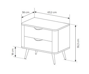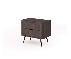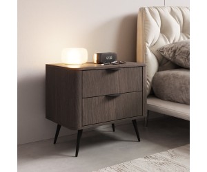 Das Möbelstück ruht auf schlanken, schwarzen Metallfüßen, die seine Leichtigkeit und den modernen Charakter betonen. Die robuste, 16 mm starke, laminierte Spanplatte mit soliden ABS-Kanten garantiert Langlebigkeit und Widerstandsfähigkeit im täglichen Gebrauch. Abgerundete MDF-Seitenleisten unterstreichen die subtile Formgebung, während ein modisches geriffeltes Detail dem Nachttisch eine unverwechselbare Optik verleiht.