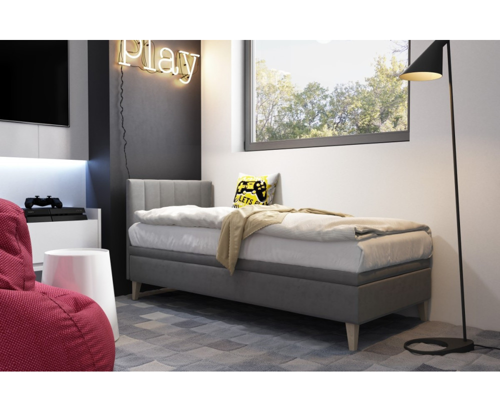 Polsterbett INTARO A8 mit Schlaffläche 120x200 cm für Teenager. Es eignet sich für kleine Jugendzimmer, in denen der vorhandene Raum optimal ausgenutzt werden muss. Dazu verfügt das Polsterbett über einen geräumigen Bettkasten, der viel Stauraum für die Aufbewahrung von Bettdecken, Kissen und anderen Gegenständen bietet. Dieses Jugendbett besitzt ein gepolstertes Kopfteil mit vertikalen Steppungen, die dem Bett einen raffinierten Charakter verleihen. Dekorative Füße aus Buchenholz sind nicht nur stabil und tragfähig, sondern bringen auch ins Interieur einen Hauch von natürlicher Eleganz. Hochwertige Verarbeitung und robuste Ausführung garantieren lange Lebensdauer.