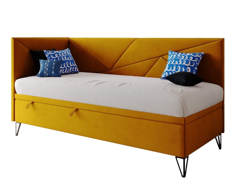 GEOMETRIC 1R ist ein Jugendbett/ Kinderbett im modernen Design. Das Bett hat einen Bettkasten, ein Kopfteil und eine Seitenblende. Charakteristisch für dieses Bett sind dreieckige Nähte an den Bezügen und Metallfüße.