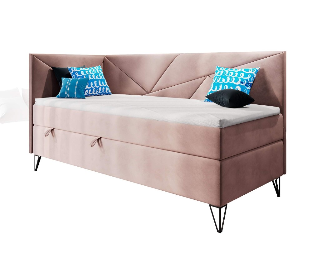 GEOMETRIC 3M ist ein Jugendbett/ Kinderbett im modernen Design. Das Bett hat einen Bettkasten, ein Kopfteil und eine Seitenblende. Charakteristisch für dieses Bett sind dreieckige Nähte an den Bezügen und Metallfüße.