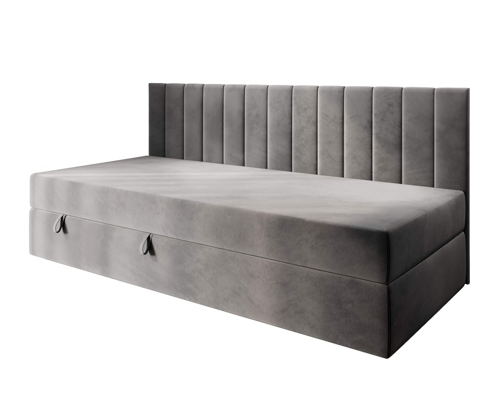 Dieses Einzelbett INTARO 35M ist ein funktionales und modernes Polsterbett, das sich hervorragend für Kinder- und Jugendzimmer eignet. Das moderne Design wird durch vertikale Nähte an der Seitenblende betont, die eine bequeme Unterstützung für den Rücken beim Lesen von Büchern oder beim Fernsehen bietet. Die Rückseite der Blende im technischen schwarzen Gewebe.