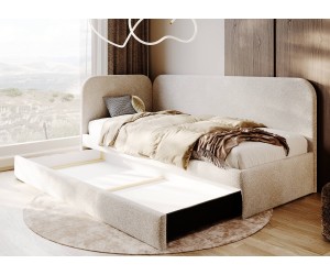 Die praktische Schublade unter dem Bett bietet einen zusätzlichen Stauraum – ideal für Bettwäsche, Kleidung oder andere Accessoires und hilft dabei, Ordnung im Zimmer zu halten. Das breite Farbschema ermöglicht es, das Bett an jede Inneneinrichtung perfekt anzupassen.