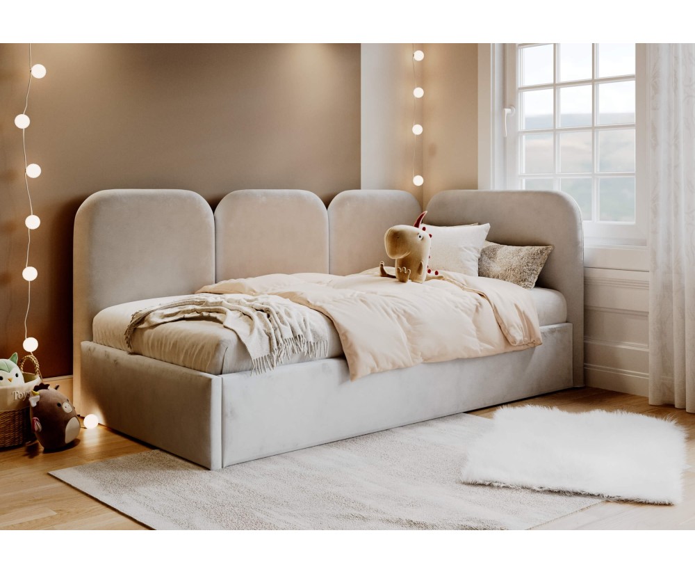 Das Bett MARGO SM 02 bietet eine Kombination aus Komfort, Funktionalität und Ästhetik. Dank der gepolsterten Oberfläche, dem Bettkasten und der freistehenden Konstruktion ist es die ideale Lösung für das Kinder-, Jugend- oder Einzelzimmer.