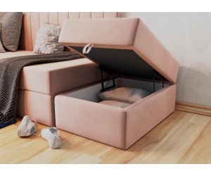Das Bett INTARO A27 verfügt über einen geräumigen Bettkasten, der unter der eleganten Polsterung verborgen wird - die ideale Lösung für die Aufbewahrung von Bettdecken, Decken und Kissen, was erleichtert, Ordnung und Ästhetik im Schlafzimmer zu halten.