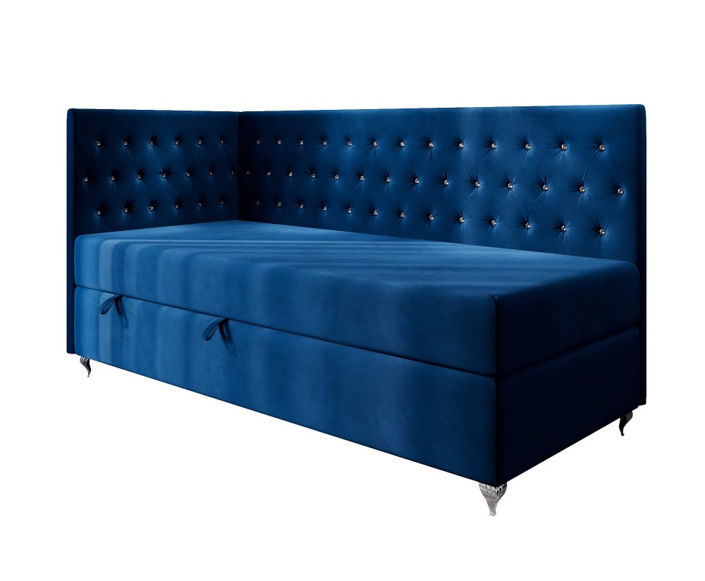 Das Bett JULIA 2M ist ein komfortables und schönes Einzelbett mit außergewöhnlichem Design. Charakteristisch sind eine elegante Ziersteppung mit Kristallen am Kopfteill und an der Seitenblende sowie dekorative verchromte Metallfüße mit der Höhe von 14 cm, die dem Möbel viel Eleganz und Glamour-Stil verleihen.