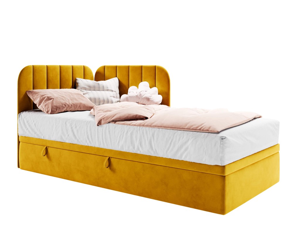 Dieses moderne Kinder- und Jugendbett ist mit zwei abgerundeten Kopfteilen ausgestattet, die das elegante Erscheinungsbild unterstreichen und gleichzeitig die Sicherheit bei der Nutzung erhöhen. Die dekorativen, vertikalen Nähte betonen einen modernen Charakter des Bettes. Der praktische Bettkasten ist mit Belüftungsöffnungen versehen, um eine optimale Luftzirkulation zu gewährleisten. Die Rückseite des Bettes ist mit einem strapazierfähigen, technischen Stoff bezogen.