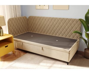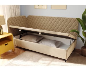 Das Bett NAOMI 1R ist die ideale Wahl für moderne Jugendzimmer. Dieses gepolsterte Einzelbett in Eckform mit einer Schlaffläche von 90×200 cm verbindet elegantes Design mit hoher Funktionalität und passt perfekt zu aktuellen Einrichtungstrends.