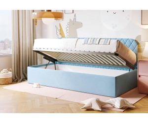 Die gepolsterte Seitenblende erhöht den Komfort beim Entspannen und verleiht dem Bett gleichzeitig einen modernen, gemütlichen Charakter, der sich ideal in Jugendzimmer-Designs einfügt.