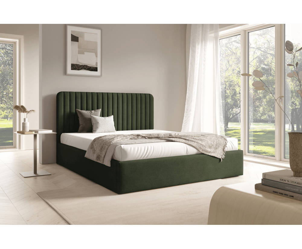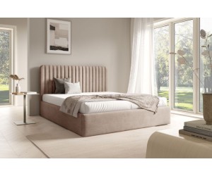 Das hohe, mit eleganten, vertikalen Nähten verzierte Kopfteil verleiht dem Bett einen zeitlosen Charakter und verbindet subtile Finesse mit moderner Eleganz. Die perfekte Lösung für alle, die Wert auf Stil und Komfort legen.