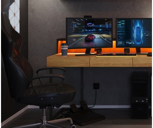 TEEN FLEX ist ein freistehender Schreibtisch mit drei Schubladen und einem Aufsatz. Der Aufsatz verfügt über eine orangefarbene Beleuchtung, die die Arbeitsplatte beleuchtet. Der Schreibtisch steht auf schlanken Beinen, was ihm Leichtigkeit verleiht.