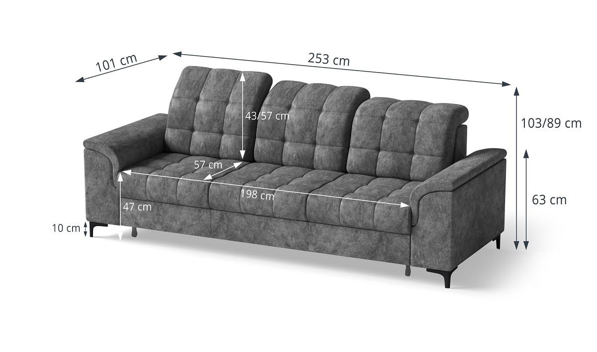 FERRO 57 ist ein modernes 3-Sitzer-Sofa mit Schlaffunktion. Bequem, funktional und elegant. Das Modell verfügt über die verstellbare Rückenlehne und die komfortabel profilierte Sitzfläche. Die Couch mit dekorativen Nähten ruht auf eleganten schwarzen Füßen, die das Gesamtbild perfekt komplettieren. Ein idealer Vorschlag für modern eingerichtete Wohnzimmer. Die solide, massive Konstruktion gewährleistet eine langlebige Qualität. Das Sofa ist freistehend, mit dem gepolsterten Rücken kann es beliebig in der Mitte des Raumes aufgestellt werden.
