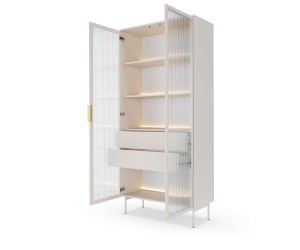 Die Vitrine SOLARIS 91 2D2S + LED im Farbton Kaschmir ist ein elegantes und funktionales Möbelstück für Wohnzimmer oder Esszimmer. Geriffelte Fronten aus gehärtetem Glas im MDF-Rahmen unterstreichen den modernen Charakter des Möbels, während die integrierte LED-Beleuchtung Dekorationen wirkungsvoll in Szene setzt und eine gemütliche Atmosphäre schafft. Praktische Einlegeböden sowie Schubladenmit Vollauszug erleichtern die Organisation des Stauraums.