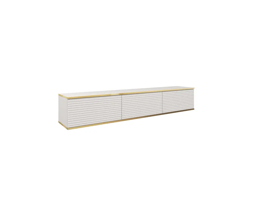 LIDO - moderner hängender RTV-Schrank, Breite 175 cm. Der Schrank verfügt über drei geriffelte Fronten - Klappen, die nach unten geöffnet werden. Sein elegantes Design mit minimalistischer Formgebung fügt sich ideal in modern eingerichtete Wohnzimmer ein und wird den Raum mit Sicherheit bereichern. Die hängende Konstruktion verleiht dem Raum Leichtigkeit und Geräumigkeit, während die Wandmontage einen wertvollen Platz auf dem Boden spart. Das Möbelstück ist aus hochwertiger laminierter Platte gefertigt, die Kanten sind mit ABS im goldenen Farbton beschichtet, was einen eleganten Charakter des Möbels absolut unterstreicht. Die Türen sind mit einem grifflosen Push-to-Open-System ausgestattet. Der Schrank ist in fünf trendigen Farbvarianten erhältlich: sandbeige, weiß, schwarz, grau.