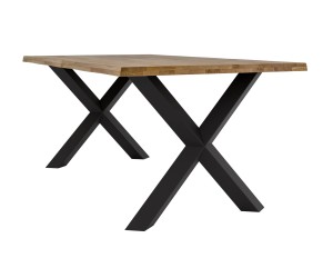 Mit der natürlichen Holzmaserung und den zarten Rundungen strahlt der Tisch Wärme und Gemütlichkeit aus und ist zugleich ein modernes und zeitloses Einrichtungselement. Das stabile, schwarz lackierte Metallgestell in X-Form bildet einen starken Kontrast zur Holzplatte und setzt einen markanten Loft-Akzent.