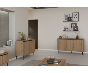 Der TV-Schrank ASTIR, Breite 178 cm, mit Schubladen, vereint perfekt das moderne Design mit der unübertroffenen Funktionalität. Seine minimalistische Form mit sorgfältig gefrästen Lamellen-Fronten führt in den Innenraum eine neue ästhetische Qualität ein. Der subtile Farbton Eiche Evoke wird mit schwarzen Akzenten bereichert, was eine ideale Farbkombination bildet. Gerade schwarze Metallbeine sind nicht nur stabil und tragfähig, sie verleihen der ganzen Konstruktion viel Leichtigkeit.