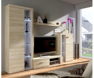 Die 4-teilige Wohnwand ROMBO verleiht Ihrem Wohnzimmer ein modernes Flair, in drei Farbvarianten zur Auswahl. Das Möbelset wird aus der hochwertigen Laminatplatte gefertigt. Zum Set gehören: eine Hochvitrine, eine niedrige Vitrine, ein hängendes Wandregal und ein TV-Schrank.