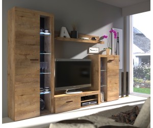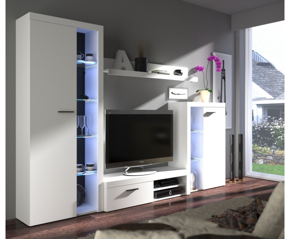 Die 4-teilige Wohnwand ROMBO verleiht Ihrem Wohnzimmer ein modernes Flair, in drei Farbvarianten zur Auswahl. Das Möbelset wird aus der hochwertigen Laminatplatte gefertigt. Zum Set gehören: eine Hochvitrine, eine niedrige Vitrine, ein hängendes Wandregal und ein TV-Schrank.
